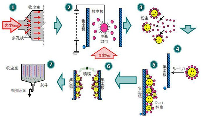 金屬放電線在直流高電壓的作用下①,將其周圍氣體電離②,使粉塵或霧滴粒子表面荷電③,荷電粒子在電場力的作用下向收塵極運(yùn)動④,并沉積在收塵極上⑤,水流從集塵板頂端流下,在集塵板上形成一層均勻穩(wěn)定的水膜⑥,將板上的顆粒帶走⑦。因此,濕式電除塵器與干式ESP的除塵原理基本相同,都要經(jīng)歷荷電、收集和清灰三個階段,區(qū)別在于清灰方式的不同,濕式電除塵器采用液體沖刷集塵極表面來進(jìn)行清灰。其工作原理如圖1。