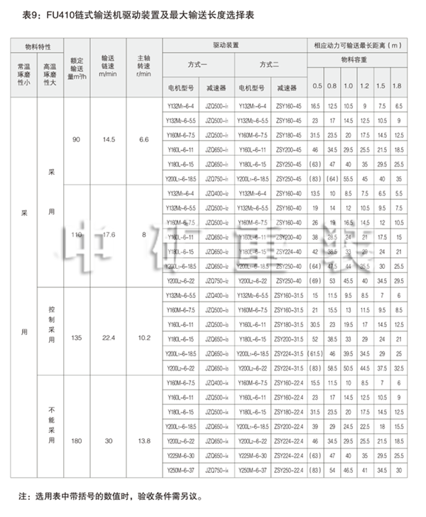 用戶應根據(jù)被輸送物料的性能、狀態(tài)(如:磨琢性、料溫、物料粒度)等因素選擇。對于輸送 水泥生熟原料和成品粉料的適宜鏈速可參照表3。其它與水泥性能和狀態(tài)相近的物料也可參照此表。