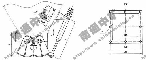 鄂式閘門由本體、扇形閘板、軸、齒輪、密封副,執(zhí)行機構等部件構成。手動或執(zhí)行機構推動搖桿,使齒輪帶動扇形閘板沿軸心旋轉,使兩個扇形閘板向兩邊開啟,物料隨即下落,待接料裝置滿載后,由執(zhí)行機構帶動搖桿,使扇形閘板復位,關閉截斷下落的物料。